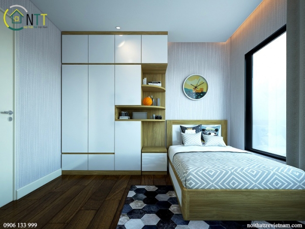 Với mẫu thiết kế này bạn có thể thấy tủ quần áo và kệ đựng tài liệu thiết kế ngay tại đầu giường, kệ đựng tài liệu thiết kế treo tường rất tiện dụng.